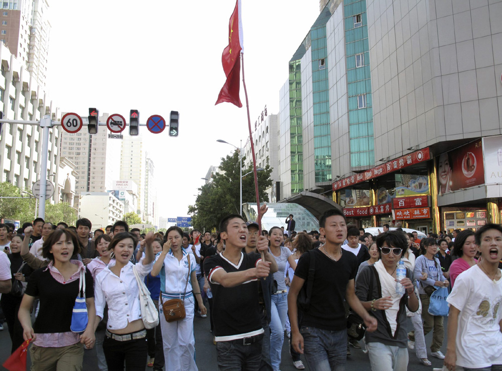 圖:烏魯木齊遊行民眾揮舞國旗前往新疆自治區黨委機關所在地人民廣場請願(路透社)