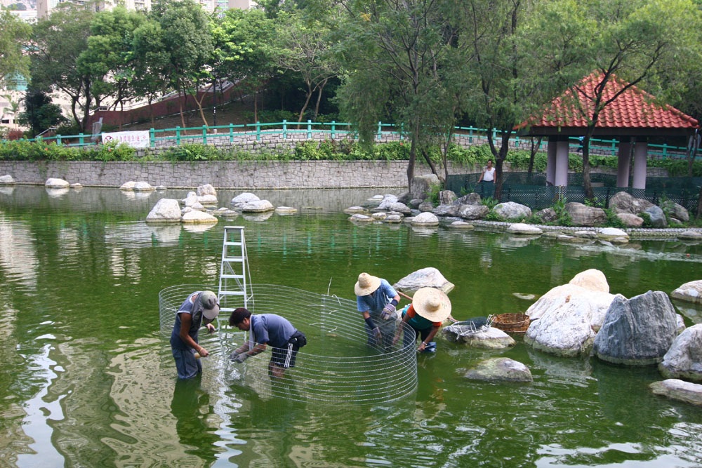 康文署早前接獲報告,稱荃灣德華公園的魚池發現巨魚,昨晨派員趕往查看,相信為具侵略性「福鱷」,於是安排員工用鐵絲網圍捕,經過連番周章,終將該條巨魚撈走,惜離水後不久便告死亡。康文署亦同時通知屬下有關水池公園職員,查看相關地點是否有人放生「惡魚」,結果發現青衣公園及柴灣公園,皆有該類魚蹤影,於是決定即時撈捕。