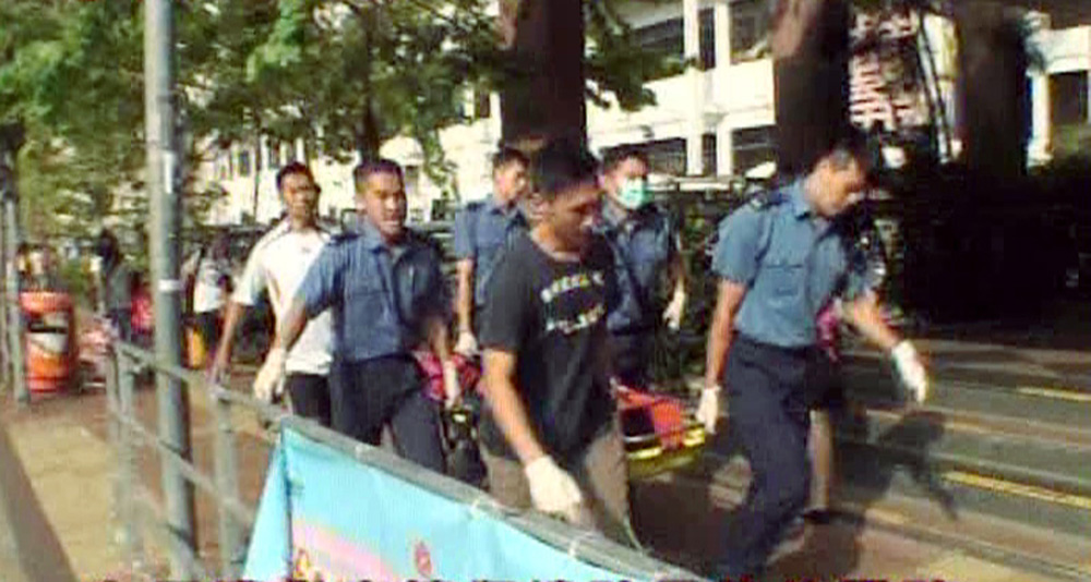圖:消防員等候約十五分鐘仍未見救護車出現,於是合力抬傷者送院。上圖為女傷者(有線電視新聞畫面)