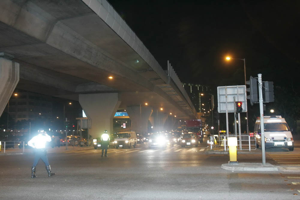 昨日凌晨二時許,大批交通警員到達觀塘繞道,將通往旺角方向兩條行車線封閉,附近可通往繞道的路口,亦一併封鎖暫禁駛入,以致附近道路擠塞;有部分司機受塞車影響,竟響號泄憤。為了重組案情,警方找來多輛汽車,在繞道上重演有關「人肉路障」情況,約一個小時後結束。