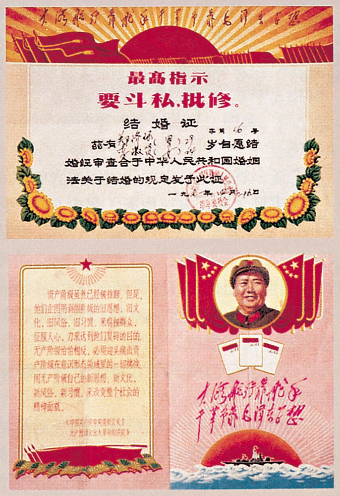 二、毛主席語錄佔據重要位置。有的將「要鬥私,批修」也印上結婚證。