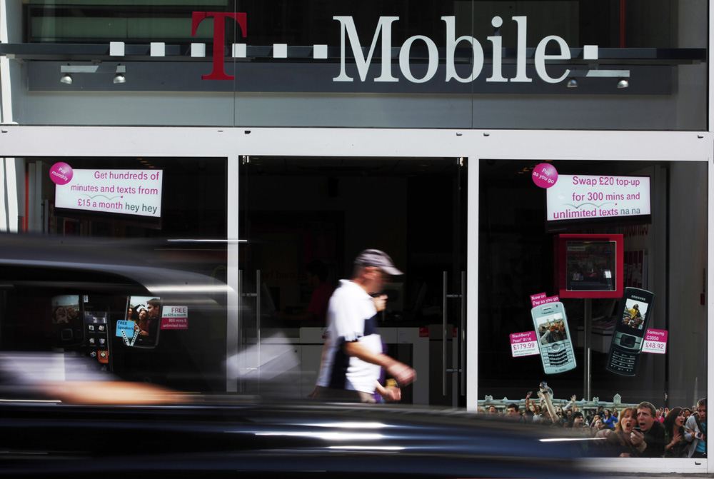 圖:沃達豐與O2出價35億英鎊競購T-Mobile英國業務。圖中購物者正路過位於倫敦牛津街的一家T-Mobile分店