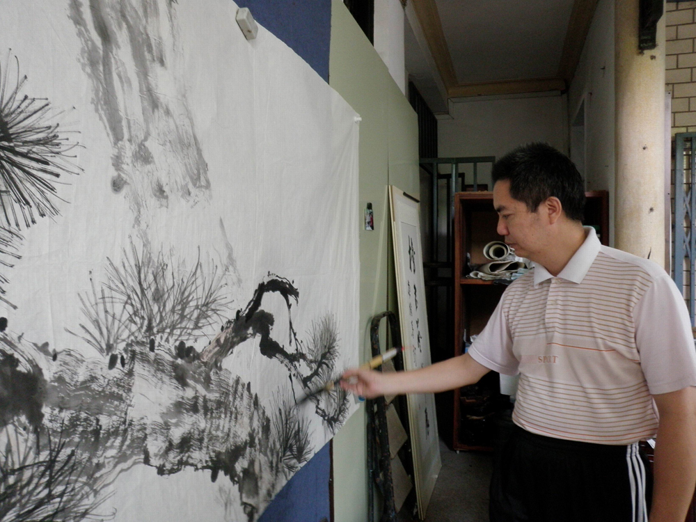 圖:張瑞亨向記者示範使用茅龍筆繪畫國畫(本報記者 黃寶儀攝)