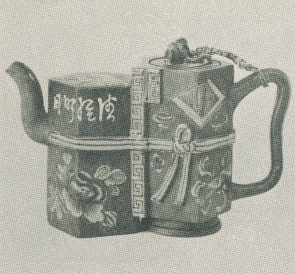 附圖為晚清(道光時期)至民初盛行的雙連體紫砂茶壺,俗稱「孖壺」;二壺皆作六方形,壺身有繫帶紋飾,好比互相綁在一起。其中一壺有蓋,另一則無。「孖壺」的容量一般中壺大;不過這類設計純為了造型美,使人覺得特別。對泡茶來說,效果反而比不上惠孟臣式的小壺。