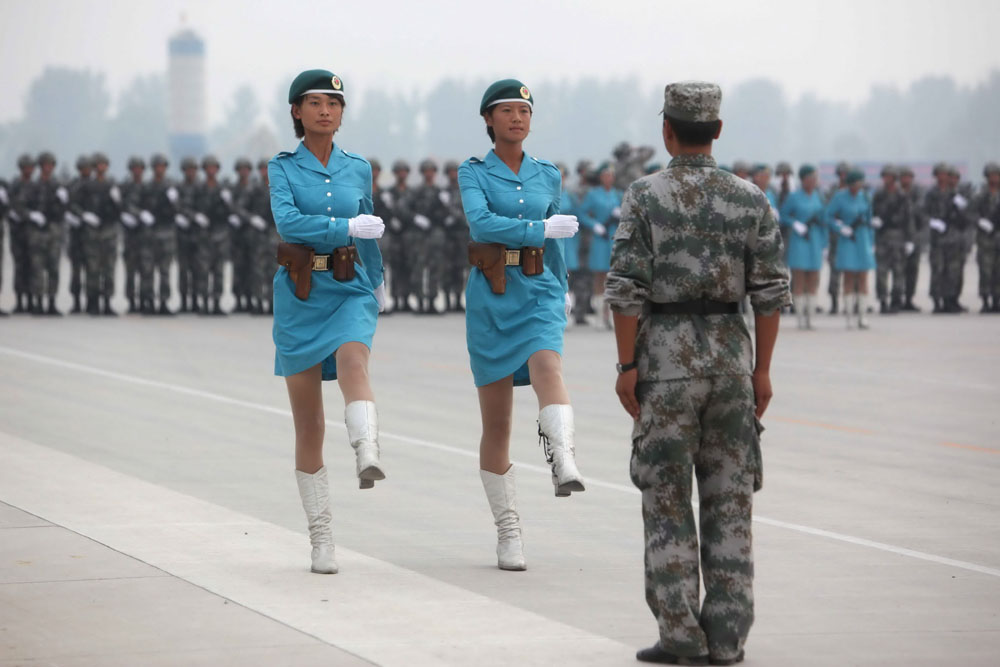 圖:一群女民兵在北京為國慶閱兵遊行排練(法新社)