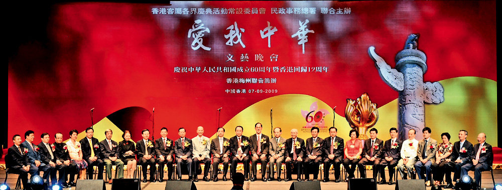 為了隆重慶祝國慶60周年暨香港回歸12周年,香港客屬各界慶典活動常設委員會與特區民政事務總署於日前聯合舉辦《愛我中華》文藝晚會,活動假座灣仔伊利沙伯體育館舉行。特區民政事務局局長曾德成,中國僑聯副主席、中聯辦協調部部長王永樂,外交部駐港副特派員詹永新,中聯辦秘書長趙廣廷,大紫荊勳賢、新界鄉議局主席劉皇發,全國僑聯副主席、廣東省僑聯主席王榮寶,廣東省僑辦副主任鄭建民等蒞臨主禮。大會主席余鵬春及大會總策劃林光如在演出之前發表了熱情洋溢的致詞,現場逾三千觀眾不斷地揮舞國旗和區旗,氣氛熱烈非凡。