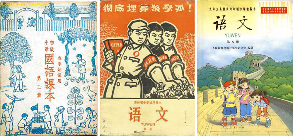 圖:左起:建國初期的小學語文課本第二冊;「文革」時期的小學語文課本;90年代的小學語文教材(網絡圖片)