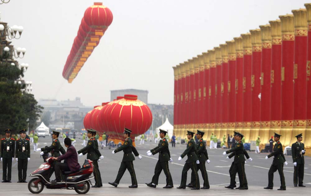 閱兵式一開始,國旗護衛隊踏着整齊的步伐,在無數雙眼睛的期盼與矚目下,完成了升旗儀式。國旗護衛隊是在廣場時間最長,正步行進最遠的一支隊伍。從人民英雄紀念碑到國旗杆,200名戰士正步走了169步,象徵着從1840年鴉片戰爭開始到2009年中華人民共和國國慶60周年所走過的路程。