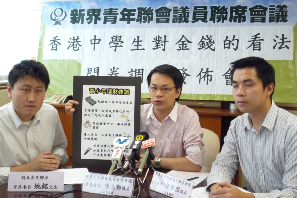 另外,近年大專生破產率急升,陳克勤認為,父母可考慮先讓子女擁有固定零用錢,學習妥善理財,否則在大學時隨意申請信用卡,未畢業已要申請破產。該會副主席黃偉傑指出,現時財務公司廣告多不勝數,不斷鼓勵借貸,促請政府監管宣傳手法,以免學生產生「無錢就去借」的想法。「一個經常借錢、常常在財務上有困難的人,他日很易債台高築。建議政府加強理財教育,協助學生從小建立正確金錢價值觀念」。