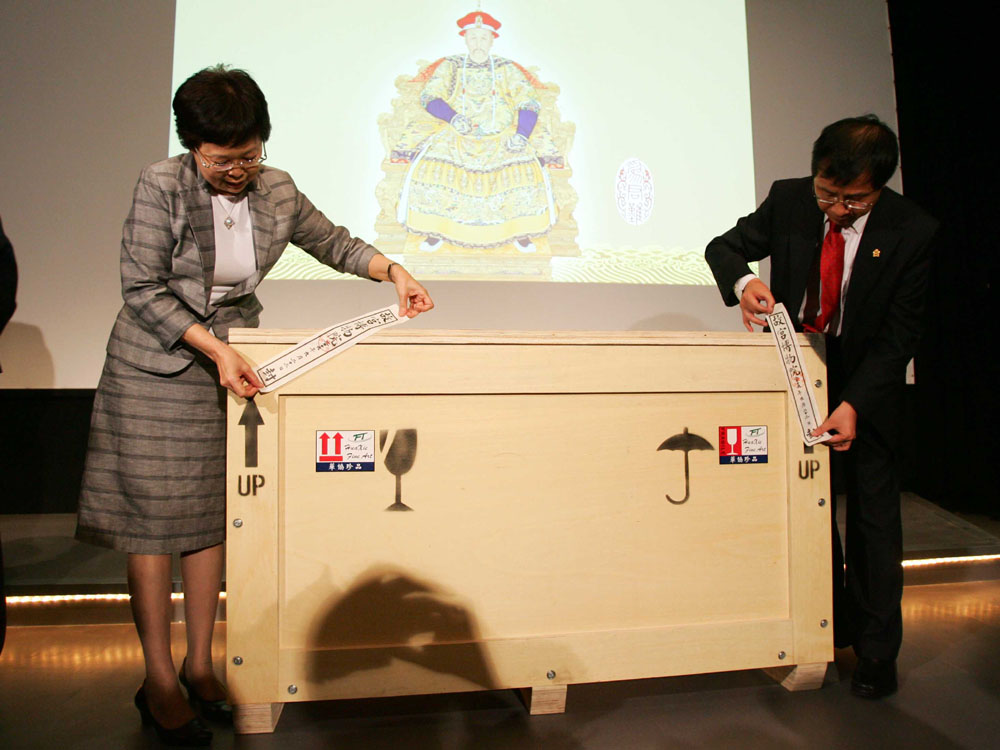 【本報訊】北京故宮的37件(套)珍貴清宮文物近日將啟運台北,參加下月7日於台北故宮舉辦的「雍正——清世宗文物大展」。這將是兩岸故宮文物分別60年來的首次團圓。在22日新聞發布會現場,北京故宮博物院常務副院長李季與台北故宮博物院副院長馮明珠在中外記者的見證下,共同為即將啟運的文物箱貼上封條。