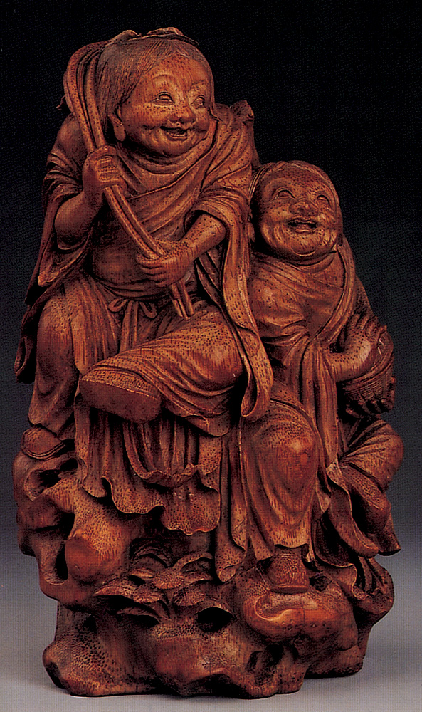 例如附圖為明代名家竹刻的和合二仙(高約廿五公分),活潑自然,融洽一致,性格呼之欲出,益覺可愛可親。這類晚明竹雕作品,可說遠溯自南北朝時代的竹刻藝術傳統與技巧,精妙細膩,慢工出細貨,流暢自然,圓渾有致。
