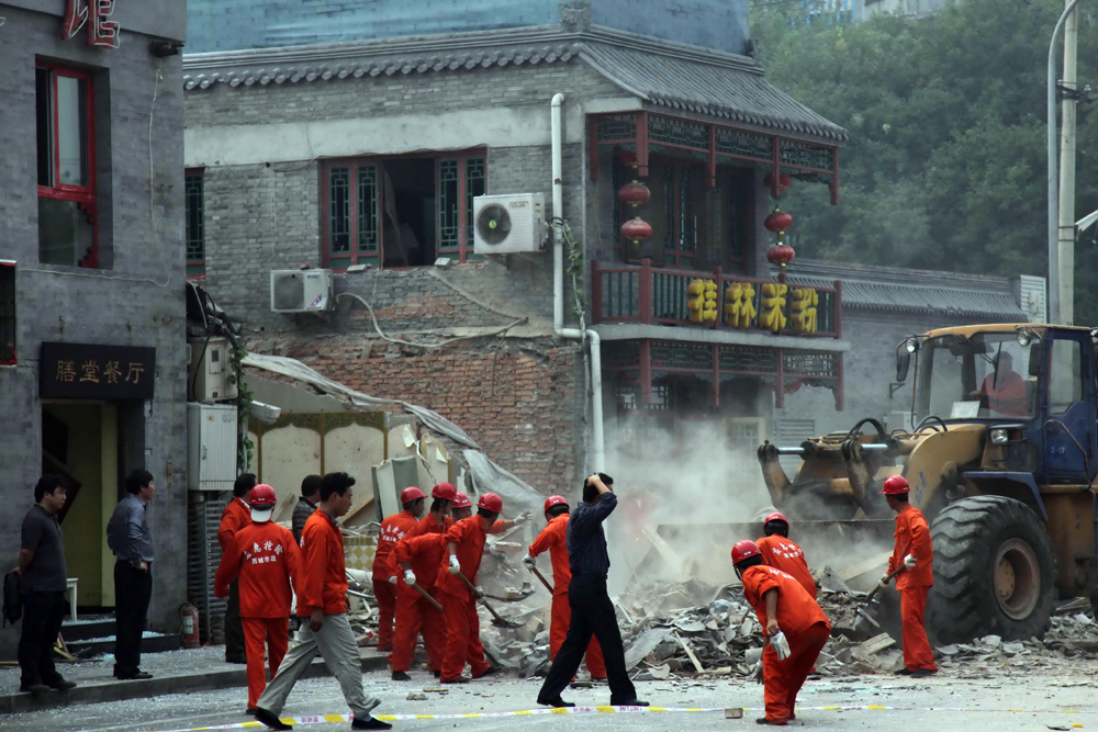 記者看到,這家2層高的建築全部倒塌,瓦礫遍地,臨近多家商舖有不同程度的損毀。與餐廳一街之隔的服裝店、小吃店均受殃及,門前全是灑落的碎玻璃。新街口大街南北雙向禁行,離餐廳百米位置拉起警戒線,能看到近百位公安、武警現場維持秩序。數十輛公安武警牌照的車輛停靠在警戒線附近。