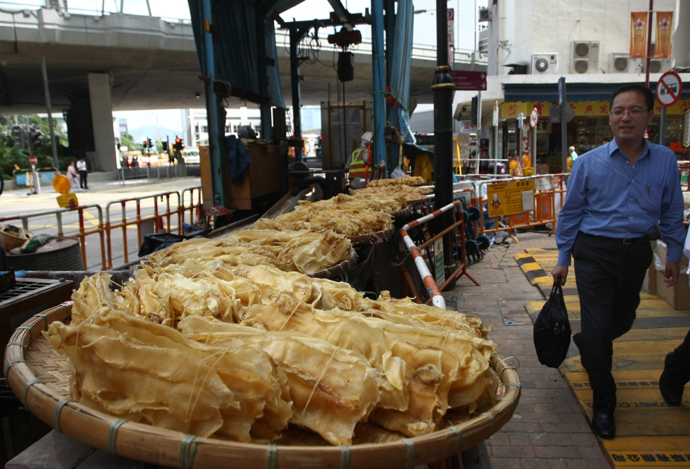 花膠據稱有養顏保健功效,但價錢昂貴,路經的途人無不心生好奇,如此貴重的食品,卻置於塵土飛揚的地盤間,沾滿塵埃,教人怎能將之用作保健?
