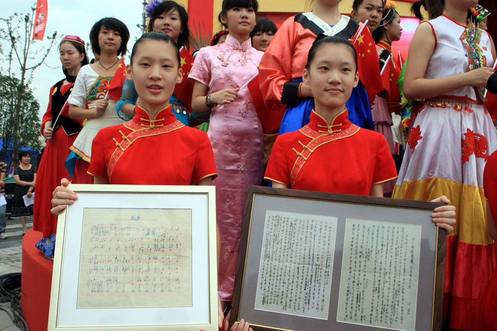 圖:國歌詞曲作者田漢、聶耳的親屬,向國歌展示館捐贈的《義勇軍進行曲》創作手稿亮相(中新社)