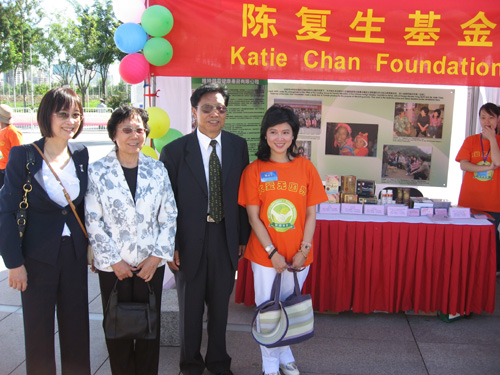 圖:中國前外交官聯誼會會長吉佩定(中國前外交部駐香港特派員)(右二)及其夫人(右三)親到陳復生(右一)及健靈慈善基金主席陳曦齡(左一)在「大愛無國界」國際義賣日設置的攤位前合影