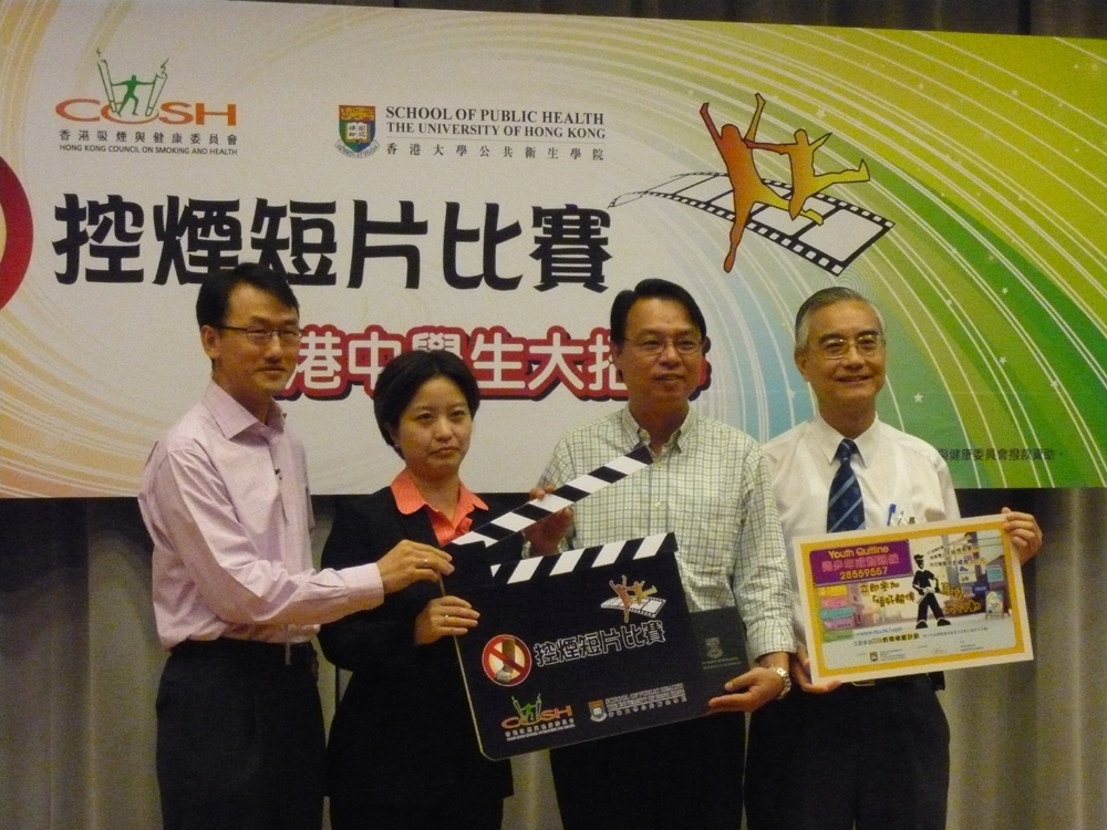 此外,香港吸煙與健康委員會及香港大學公共衛生學院於○九至一○年合辦「控煙短片比賽」(見左圖),活動將邀請全港四十萬名中學生參與,拍攝以戒煙、二手煙或異化吸煙為主題的短片,藉互動手法宣傳控煙信息,確立年輕新一代無煙文化的生活態度。