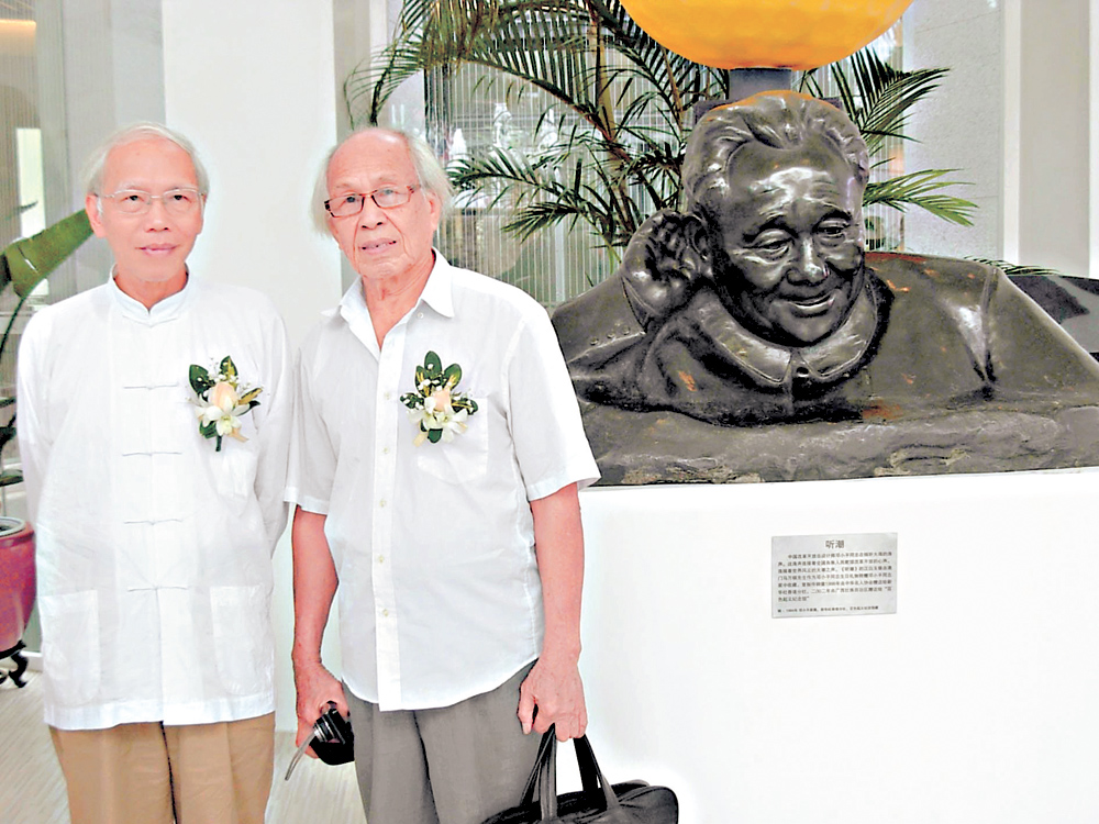 圖:曹崇恩(右)、陳永正在《聽潮》的鄧小平複製銅像前留影(本報攝)