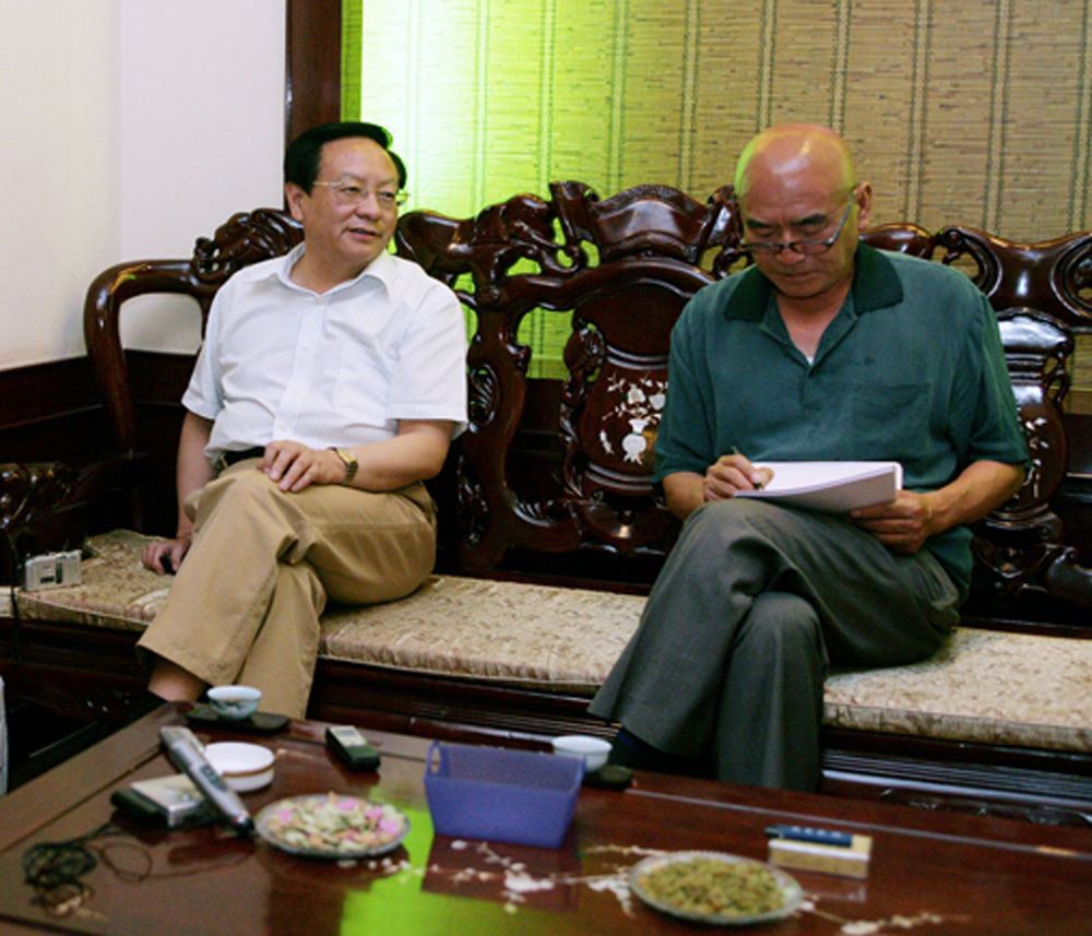 圖:鄂爾多斯市委書記杜梓(左)與作家交流工作