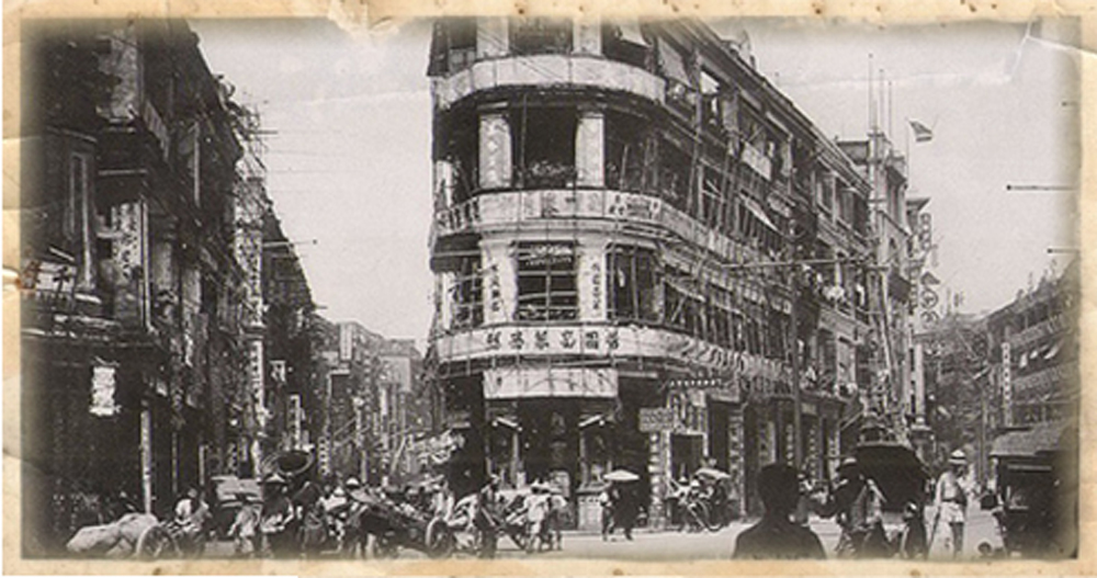 圖:老照片中的是20世紀初永樂街與德輔道中交界,當年不少苦力從街尾的三角碼頭運來各式海味糧油雜貨,在馬路上來往如鰂