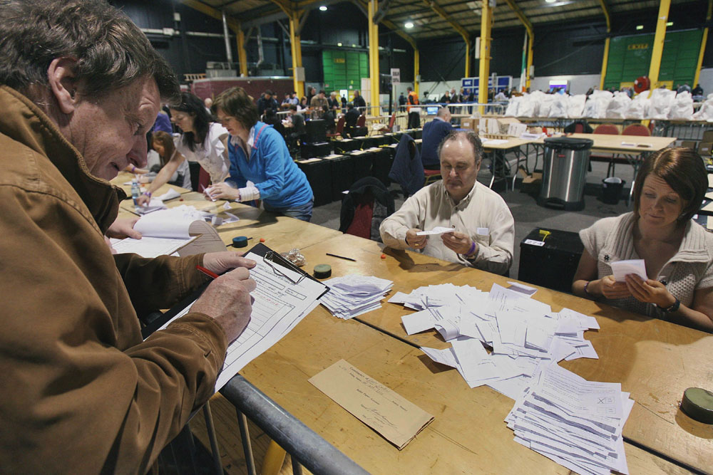 圖:十月三日,旨在推動歐洲一體化進程的《里斯本條約》在愛爾蘭全民公投中獲絕對多數支持而通過。圖為工作人員在都柏林計票中心點票(美聯社)