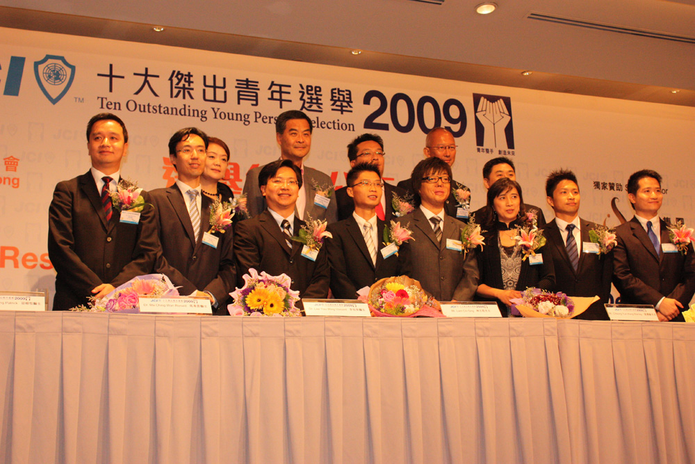 圖:國際青年商會香港總會昨日公布「十大傑出青年2009」結果,今年共有八位傑青獲選(前排八位)(本報攝)