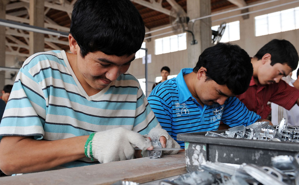 圖:廣東韶關旭日國際有限公司員工七日結束國慶和中秋假期返回工廠生產,目前生產狀況穩定。這是員工圖爾蓀江·圖爾貢(左)在工作(新華社)