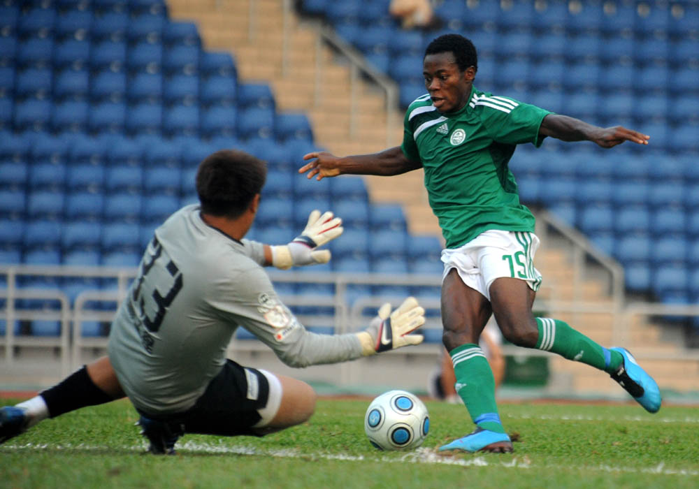 圖:大埔前鋒安基斯(右)盤球越過愉園門將張偉康 (本報攝)