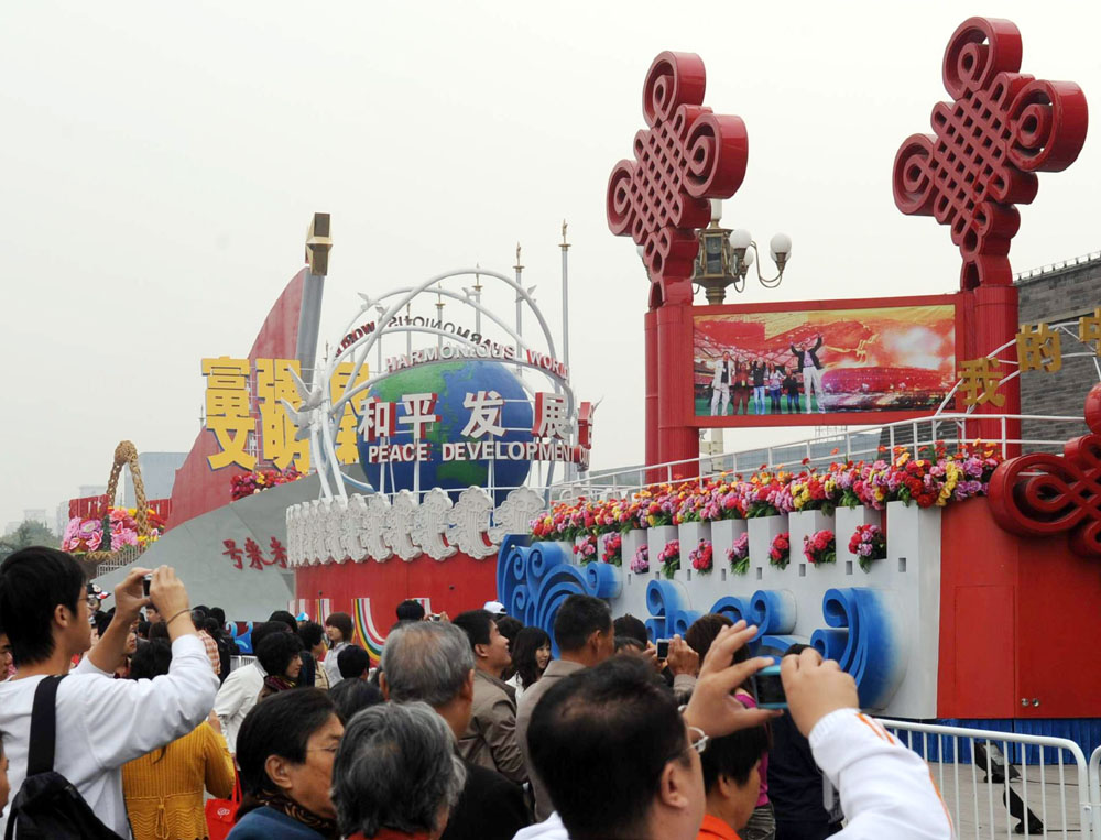 圖:正在北京天安門廣場進行靜態展示的國慶彩車,連日來吸引眾多遊客前來參觀(新華社)
