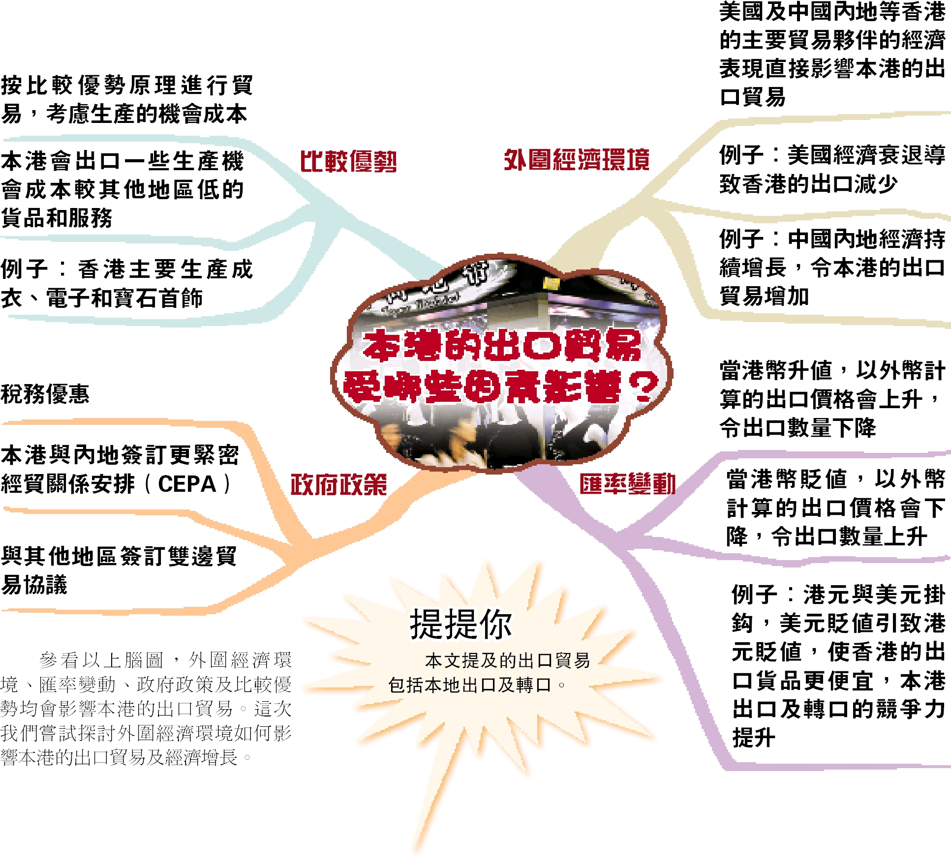 在上一期(9A期,10月13日A32版),我們已看過有關報道。究竟本港的出口貿易受哪些因素影響?我們可選取其中一個因素深入研究,以探討該因素如何影響本港的出口貿易及經濟增長。以下腦圖有助我們選取有興趣研究的方向。