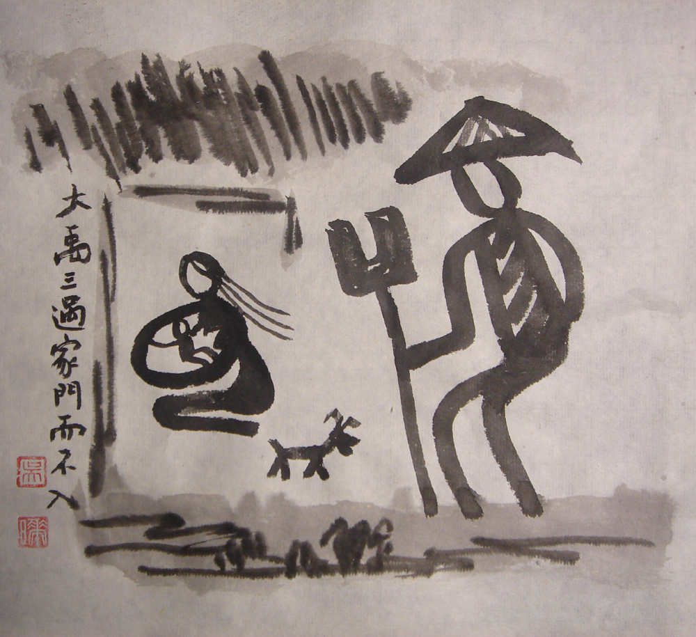這個巨大的工程整整持續了十三年,其間湧現出無數的先進典型和動人事跡。這裡面,大禹同志的事跡最為感人。他捨家為國,忘我工作,新婚只有四天就離家赴任,三過家門而不入,就連新生的兒子也無暇照顧。從關中、中原到東海,從華北到江南,無處不留下他的光輝足跡,由於日夜操勞,禹的臉曬黑了,人累瘦了,甚至連小腿肚子上的汗毛都因整天走路而被磨光了,腳指甲也因長期泡在水裡而脫落。當然,苦不是白吃的,治水最終取得巨大成功,汪洋澤國變成了和諧家園,人民生活欣欣向榮,國家形勢一片大好。