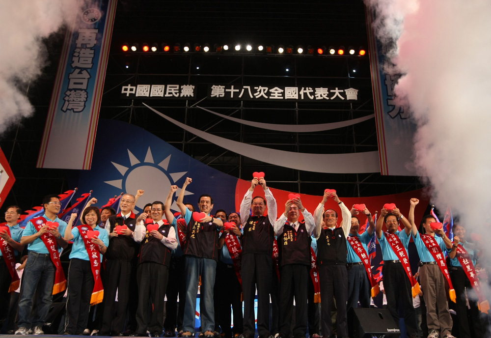 圖:國民黨黨代會昨日在台北縣新莊體育館舉行,馬英九(中)接任主席後,帶領國民黨縣市長參選人造勢,營造團結氣勢(中央社)