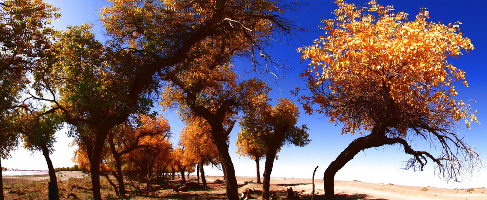 四道橋到處是巨大的胡楊樹,樹幹粗大,造型千姿百態,是拍胡楊林的最佳地點。而六道橋有大片的無邊無際的胡楊林,走在金葉鋪就的林間,偶或可以看到蒙古牧人騎着駱駝穿行其間。六道橋一帶是可以走進胡楊林最深處的地區,一路走進去會發現形態各異的胡楊樹,古老的枝幹隨處可見,造型千姿百態。而二道橋是唯一有水相伴的胡楊林,盈盈秋水,流淌着秋天的身影和神韻,藍天黃葉在水中的倒影,亦真亦幻。