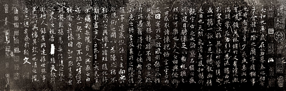 誠然,也不排除作偽大家豐坊摹刻此石時摻入己意或個別印章的訛、偽。但有一點可以肯定,早於豐二百五十年的元郭天錫跋就已明確記述:帖上有唐太宗等三唐帝王之印和禇遂良檢校、宋米芾之印,業足以佐證此冠絕古今之帖。再退一步,即使把本帖上所有印迹全部去除,與豐偽本、定武本及所有本相比,其字迹依然是曠世之迹。