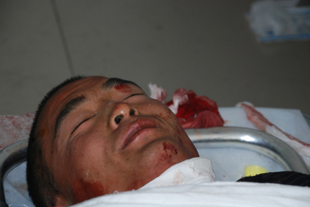 中午12點多,記者在和林醫院看到,喬海強躺在一張病床上,有血跡的手上燃着一支煙,手在微微顫抖。據看管的警察說,喬海強情緒目前比較穩定,沒有生命危險。被制服後到現在他幾乎沒說過什麼話。