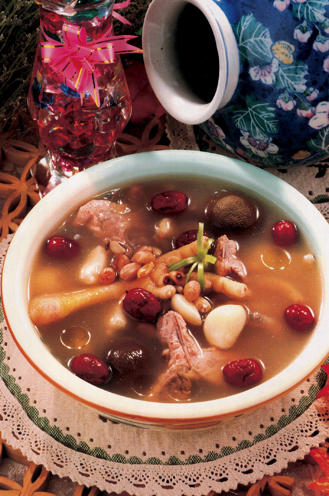 按語:此湯乃粵人家常湯水。本湯採用豬脊骨是取其骨髓中的鈣質作補充食療;至於雞腳,用它以形補形。花生,原名落花生,性味甘、平。可潤肺、和胃。治燥咳、反胃、腳氣、產婦乳少。眉豆,原名白豆,又名飯豆。性味甘,鹹、平。入脾、腎經。功能調中益氣,健脾益腎。並補五臟,益腸胃,兼調經脈等。紅棗能補血醒脾,開胃養心。陳皮有理氣健脾,燥濕化痰。蒜子有行滯氣,暖脾胃,消癥積,破冷氣,消肉滯等功用。各物配合,對由於缺乏營養而發生的雙足痿軟無力及腳氣等病有食療功效。