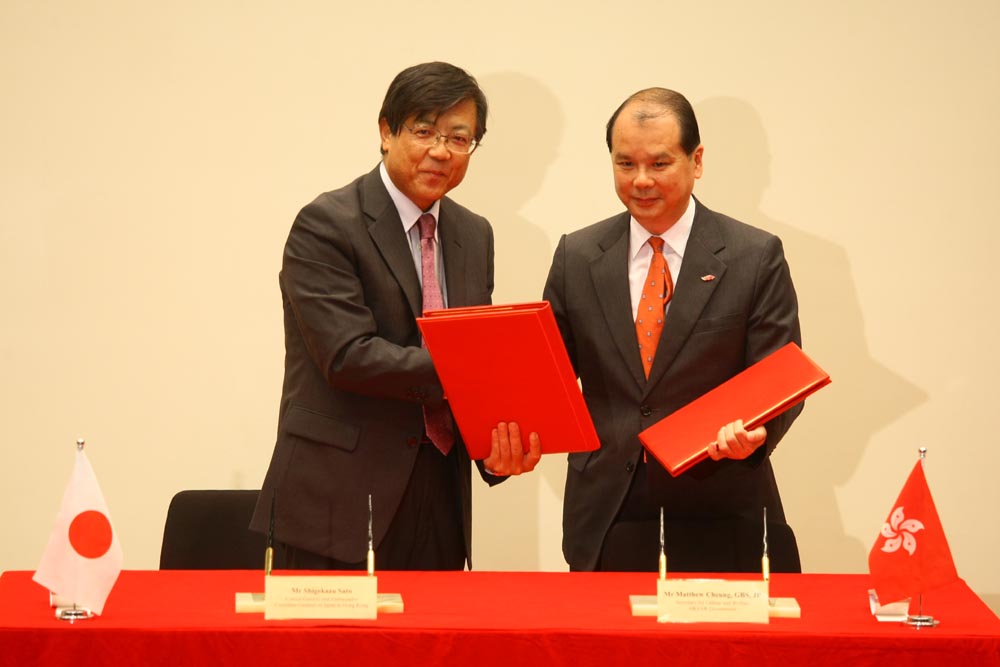 圖:張建宗(右)與佐藤重和(左)代表香港及日本政府簽署雙邊工作假期計劃文件 (杜漢生攝)