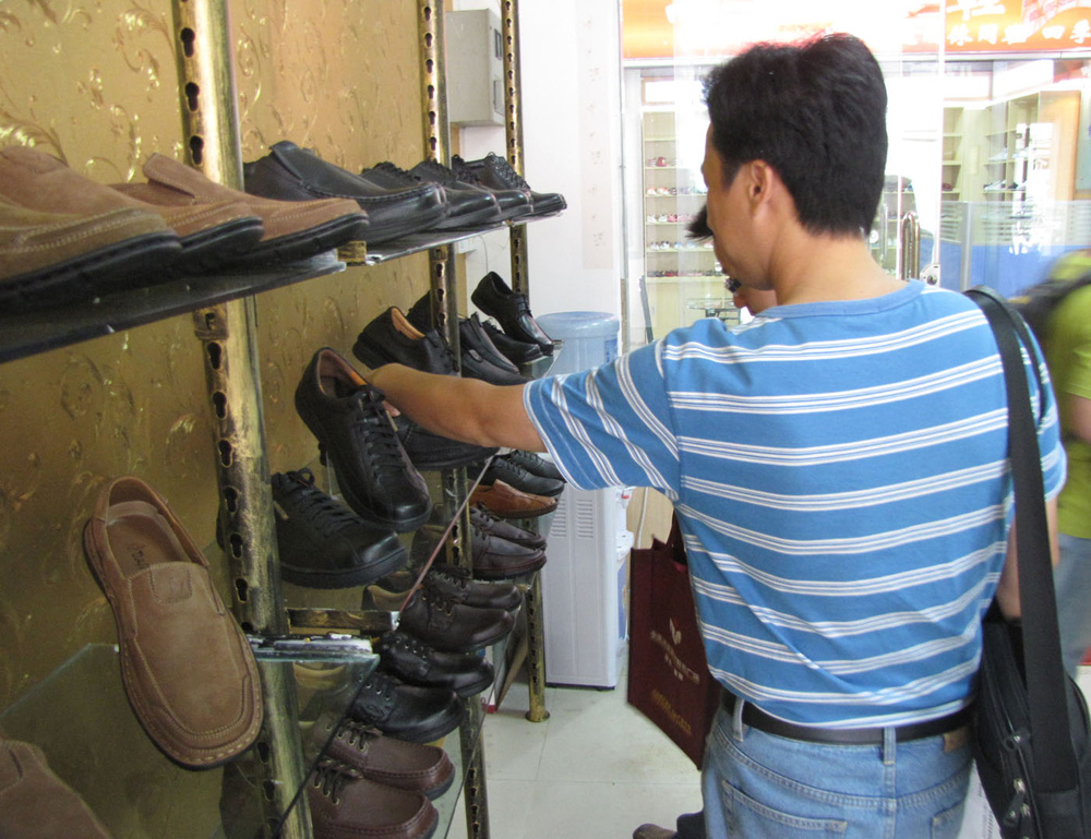 圖:東莞啟動外貿鞋直銷中心試點項目,圖為市民正在選購廠家直銷的外貿鞋(本報攝)