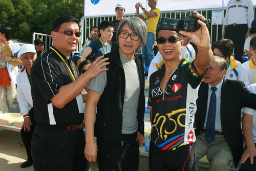 一向愛踏單車的周星馳,昨日以開幕嘉賓身份出席國際小輪車場開幕禮,不過活動於空曠場地舉行,令星爺和同場的嘉賓都被迫乾曬個多小時,幸他不時和同台的曾德成交談,看來心情大靚。