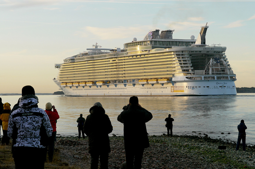 圖:全球最大郵輪「海洋綠洲」號緩緩駛出芬蘭圖爾庫港(美聯社)