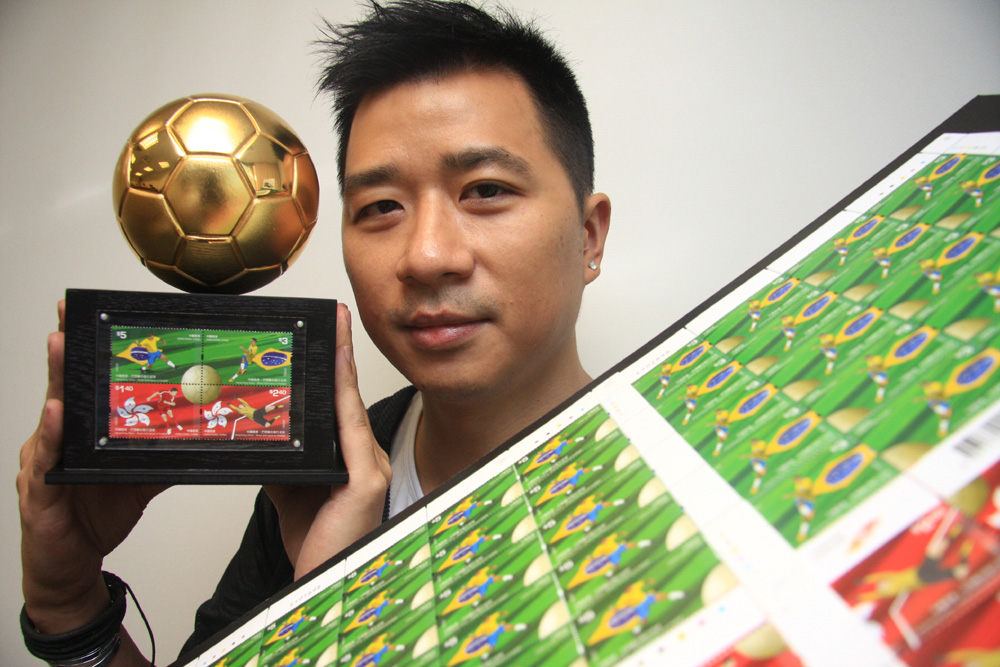圖:足球郵票設計師黃鎮康手持香港及巴西聯合發行足球特別郵票及足球禮盒(本報攝)