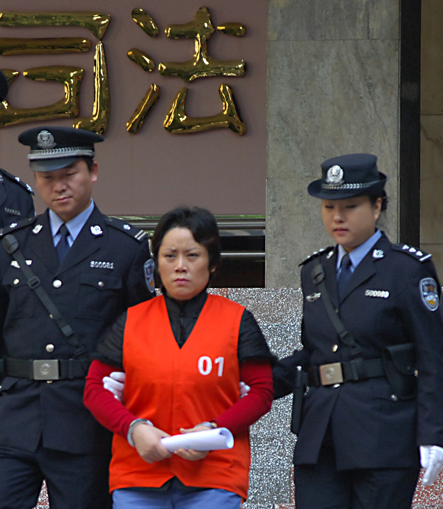 圖:重慶「黑老大」謝才萍被判處有期徒刑十八年,宣判後,謝才萍被押解離開法庭(新華社)