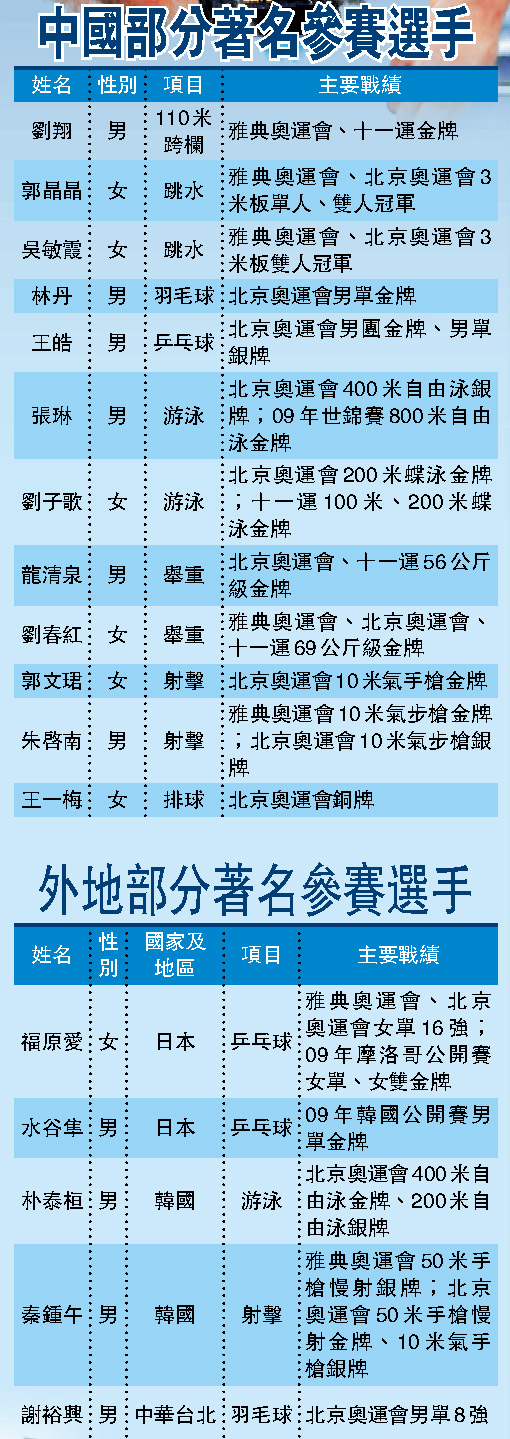 東亞運公司昨日公布中國隊參賽名單,中國今次共派出四百七十四名運動員的龐大代表團,成員更是精銳盡出,堪稱「鑽石陣容」。傷愈復出後光芒四射的「欄王」劉翔,以及跳水名將郭晶晶、羽毛球好手林丹等十多名北京奧運會金牌得主都將聯袂來港,令今屆賽事「星光熠熠」。本報記者 吳以琳 黃雪峰