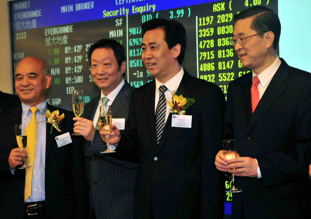 圖:恒大地產昨首日掛牌,恒大主席許家印(右二)、新世界發展董事總經理鄭家純(左)、港交所行政總裁周文耀(右)出席上市儀式(中新社)