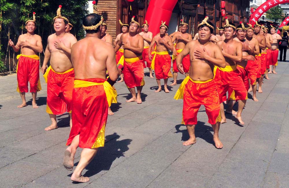 6日,福建藝術節「非遺」展在福州三坊七巷展出。福建省國家級非物質文化遺產之一─泉州拍胸舞助興演出。(中新社)