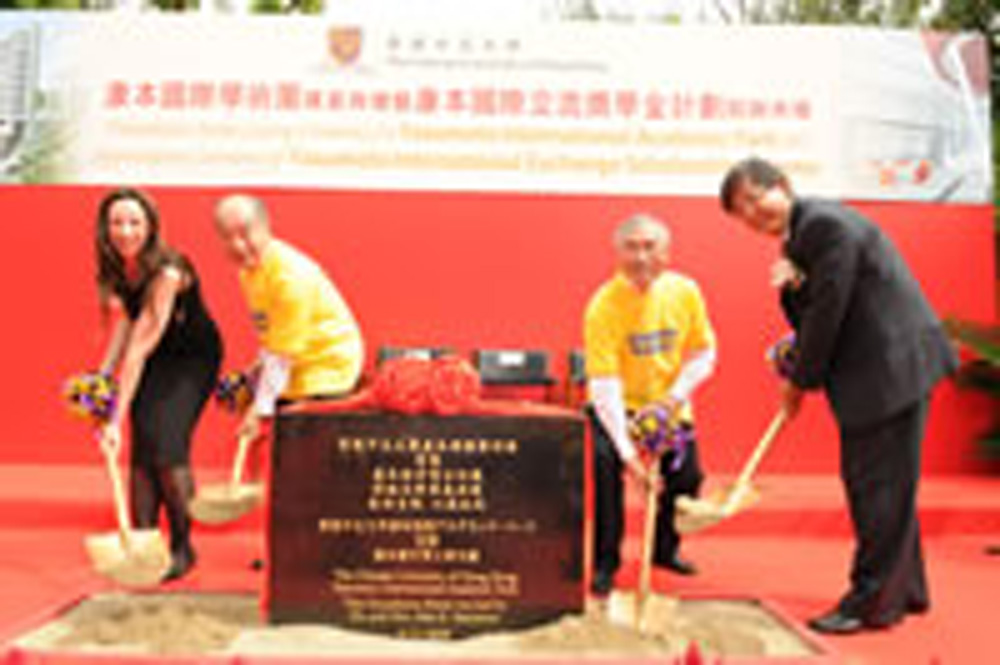 圖:康本國際學術園奠基禮。右起:日本駐香港總領事佐藤重和、中大校長劉遵義,以及康本健守伉儷