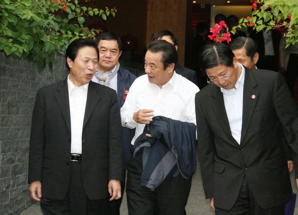 圖:江蘇省委書記梁保華(左)昨日抵日月潭涵碧樓飯店,在前往碼頭搭船遊湖前,梁保華與台灣工業總會理事長陳武雄(中)等人都拿掉領帶,準備輕鬆遊湖(中央社)