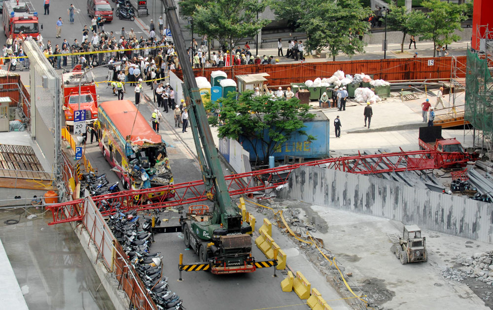 今年四月二十四日下午,廣東省旅行團搭乘的遊覽車行經台北市信義計劃區時,突遭自高樓墜落的起重機吊臂砸中,造成三人死亡。