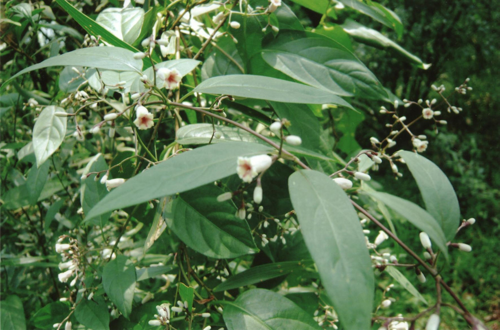 雞屎藤(Paederia scandens),茜草科雞屎藤屬藤本,莖多枝。葉對生,紙質,揉碎後有臭味。花頂生或腋生,淡紫色。果小,球形。雞屎藤味甘澀,性平,常用於肝膽或胃腸絞痛,小兒消化不良,風濕骨痛等,具清熱解毒,止痛,消食健胃,祛風利濕的作用。