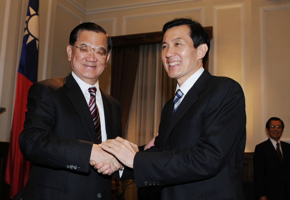 圖:馬英九(前右)十七日接見連戰(左),稱讚他參加APEC成果豐碩          (中央社)