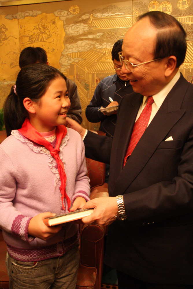 圖:蔣孝嚴(右)昨日向「感動台灣」的11歲女孩楊卓西(左)贈送禮物